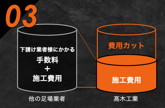 当方は、お問い合わせから施工・作業後の解体まで一貫して承る自社施工店です。そのため、下請け業者様にかかる費用が発生しません。コストを抑えられるうえに、さまざまな現場を経験している鳶職人が施工を担当するため、品質も高い。